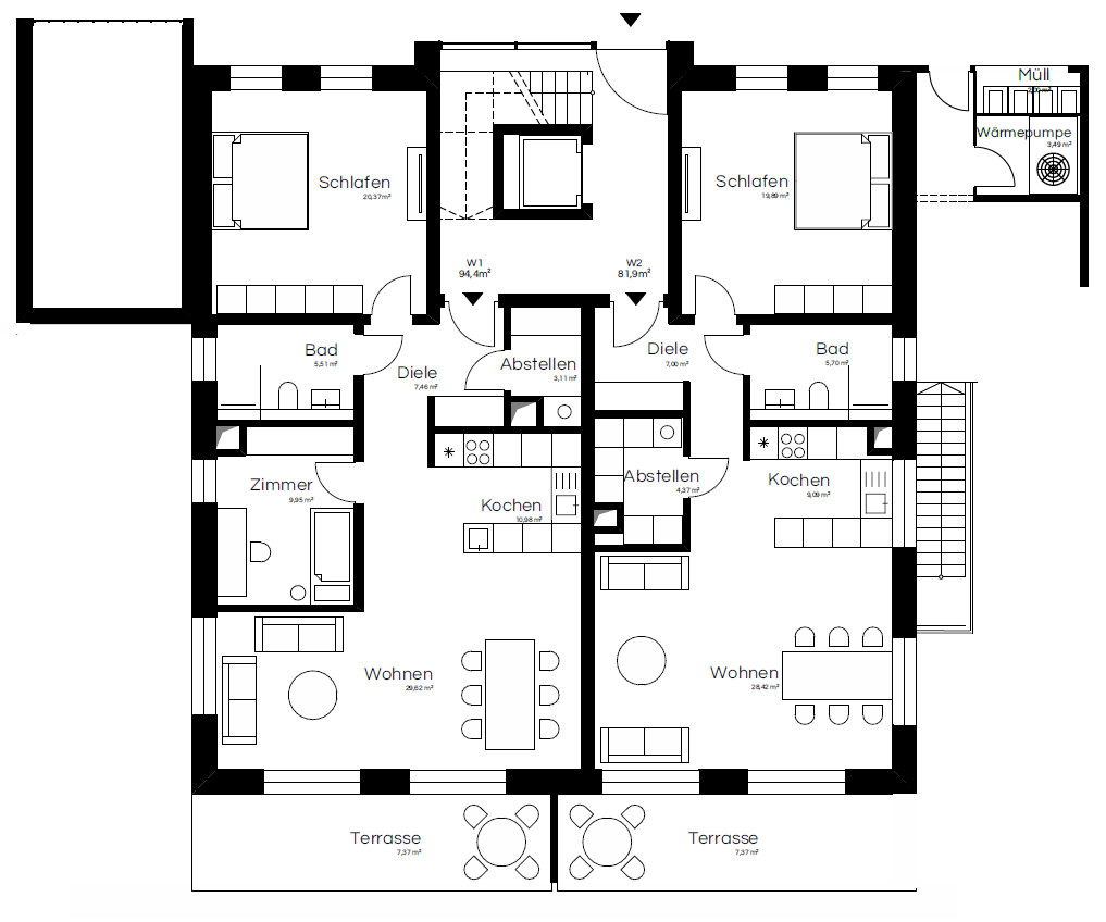• Zwei Schlafzimmer mit komfortablem Grundriss